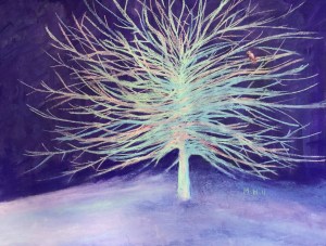 I was working on a painting of a winter tree as things started to unfold, and without any particular intent on my part, I found the painting taking a somewhat unusual turn. It was stylized, with shimmering color. It was clear to me that the painting was no longer a portrait of a winter tree, but now represented something about the onset of the pandemic. Here is “Pandemic 1.”