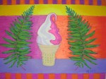 “Summer in Vermont 3,” 9″ x 12″. This is the last in the series…..unless I get inspired again! I made an even stronger graphic design with this one, simplifying the ferns a bit and adding bright bands of color. I like it! It’s a black raspberry/vanilla twist cone, mmmmm. ($200 unframed, plus tax & shipping.)