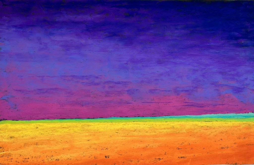 “Hypothesis,” 12″ x 17″. With pastel, we often layer colors to create a more complex visual effect. You can see that in this painting. But there are also layers of color in the sense of tiers, too. This painting is all about color and the relationships among them. [$450 framed, plus tax and shipping.]