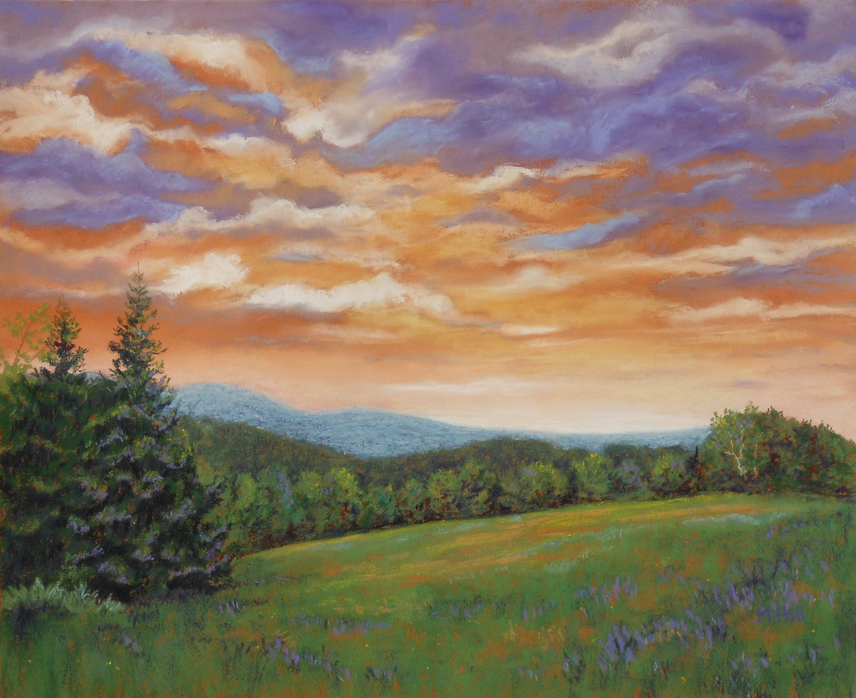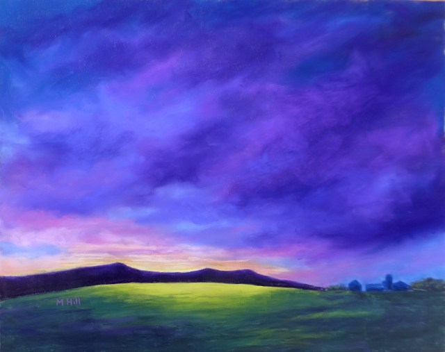 “A Graceful Ending,” 11″ x 14″. A truly beautiful sunset in Greensboro, VT. I particularly liked the shape of the mist echoing the shapes of the clouds.