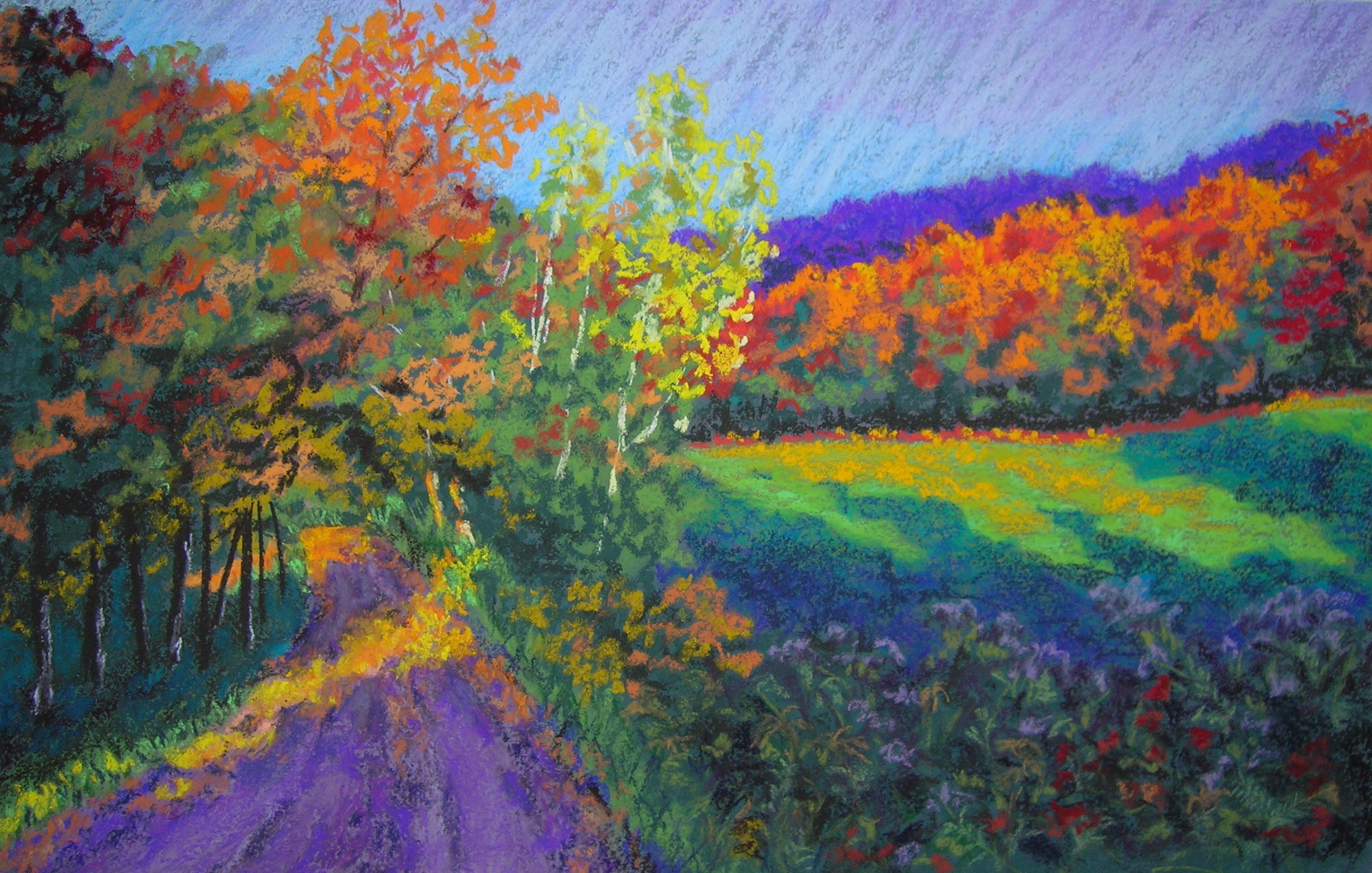 “Why I Live Here,” 18″ x 24″. Honest, this is not exaggerated. A view in my town, just an “ordinary” fall view. It’s why I live here!  This just won first place for pastels in the Champlain Valley Fair!