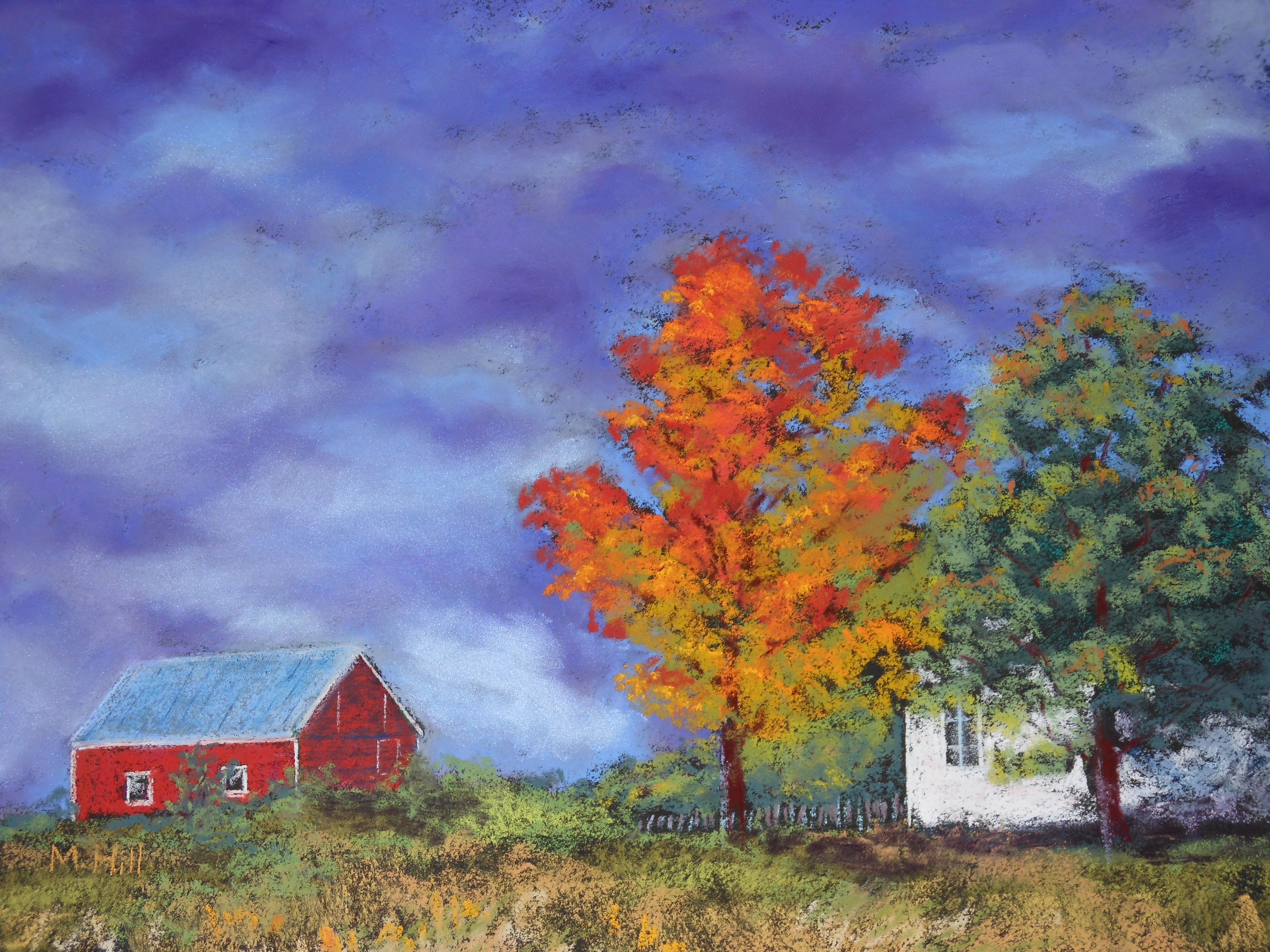 Hill - White Birch, Red Maple“White Birch, Red Maple,” 12″ x 9″. I liked the columns of color in this scene: the dark green of the evergreen, the gold, that amazing red, and then the stark, almost leafless birch with its lighter green. The maple is the star of the show here! It was an overcast day, with nothing in the sky or in the pale gold of the grasses to detract from that brilliant scarlet.
