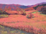“Dawn Glow,” 9″ x 12″. I distorted the colors here, until I was left with almost a magenta in the hills. You’d think I would be happy enough with all the color in a Vermont autumn! But that magenta adds a richness that better coveys the power of fall combined with the glow of sunrise.