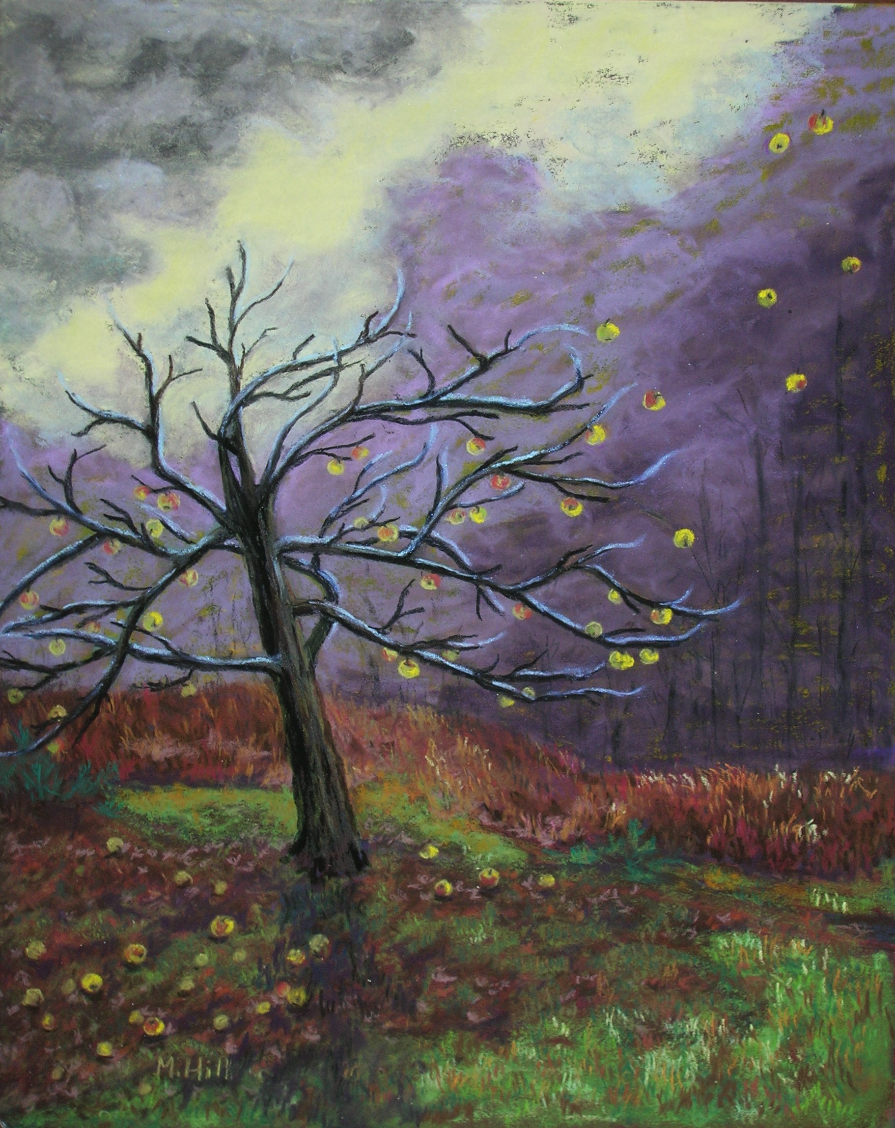 “November’s Gravity,” 16″ x 20″. This painting started in my mind long before I ever started painting at all. In November, the sky is often a leaden gray; it looks so heavy. In contrast, the apple trees, their leaves long gone, still hold the apples like a cloud among the branches. They don’t look attached to the tree; they look as if they might float right off into the sky! It seems like gravity is all mixed up, with the floating apples and the heavy sky. Look carefully at this little thumbnail photo, and you will see the apples floating off into the upper right of the painting.