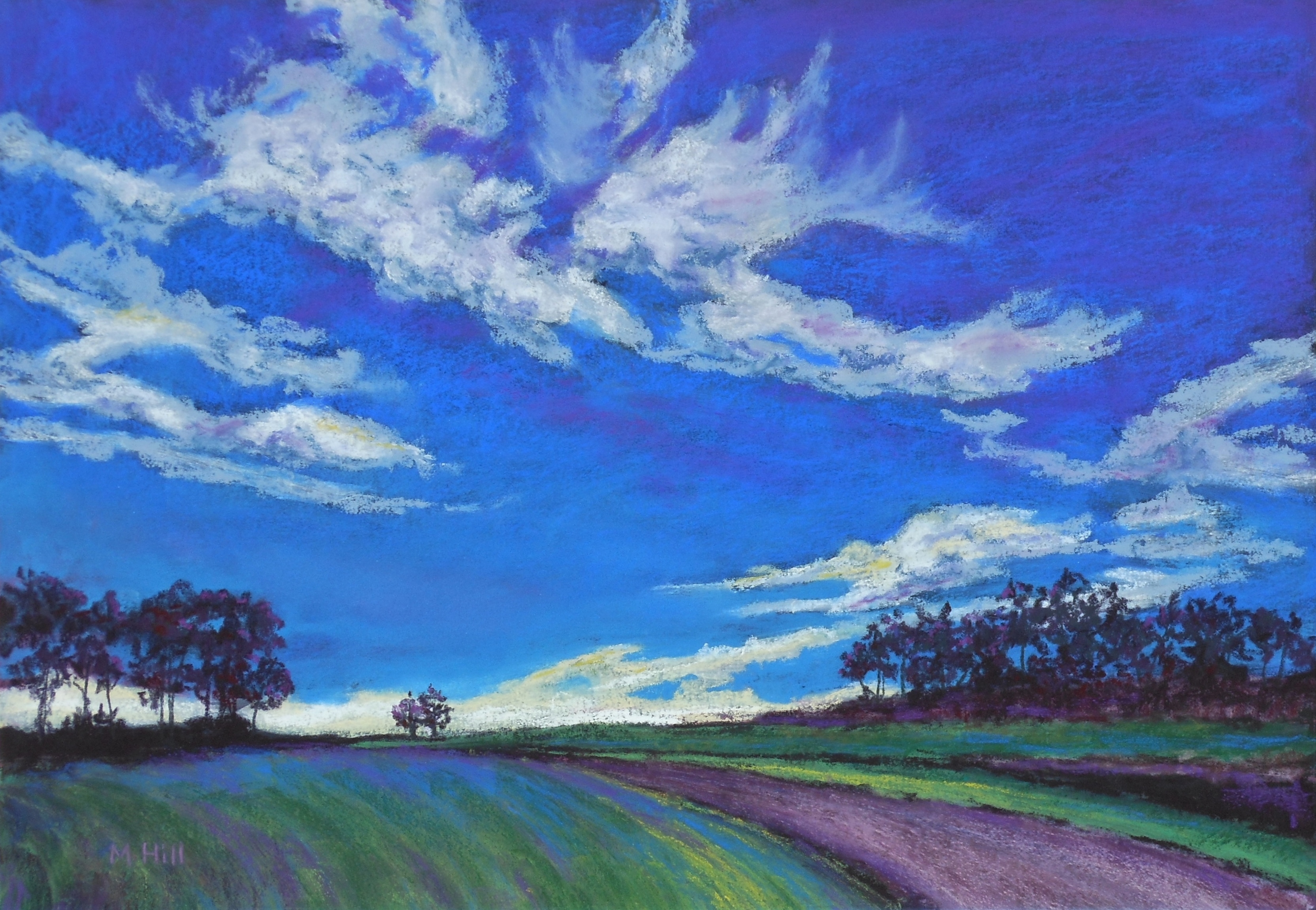 Holding the Sky “Holding the Sky,” 24″ x 18″, acrylic. This was my first attempt at painting in acrylic. They handle very differently indeed from pastels. The tree is roughly modeled after a photo of a local tree, but the sky, of coursed, is invented. I like how the curve of the tree’s limbs appears almost to carry the clouds. [
