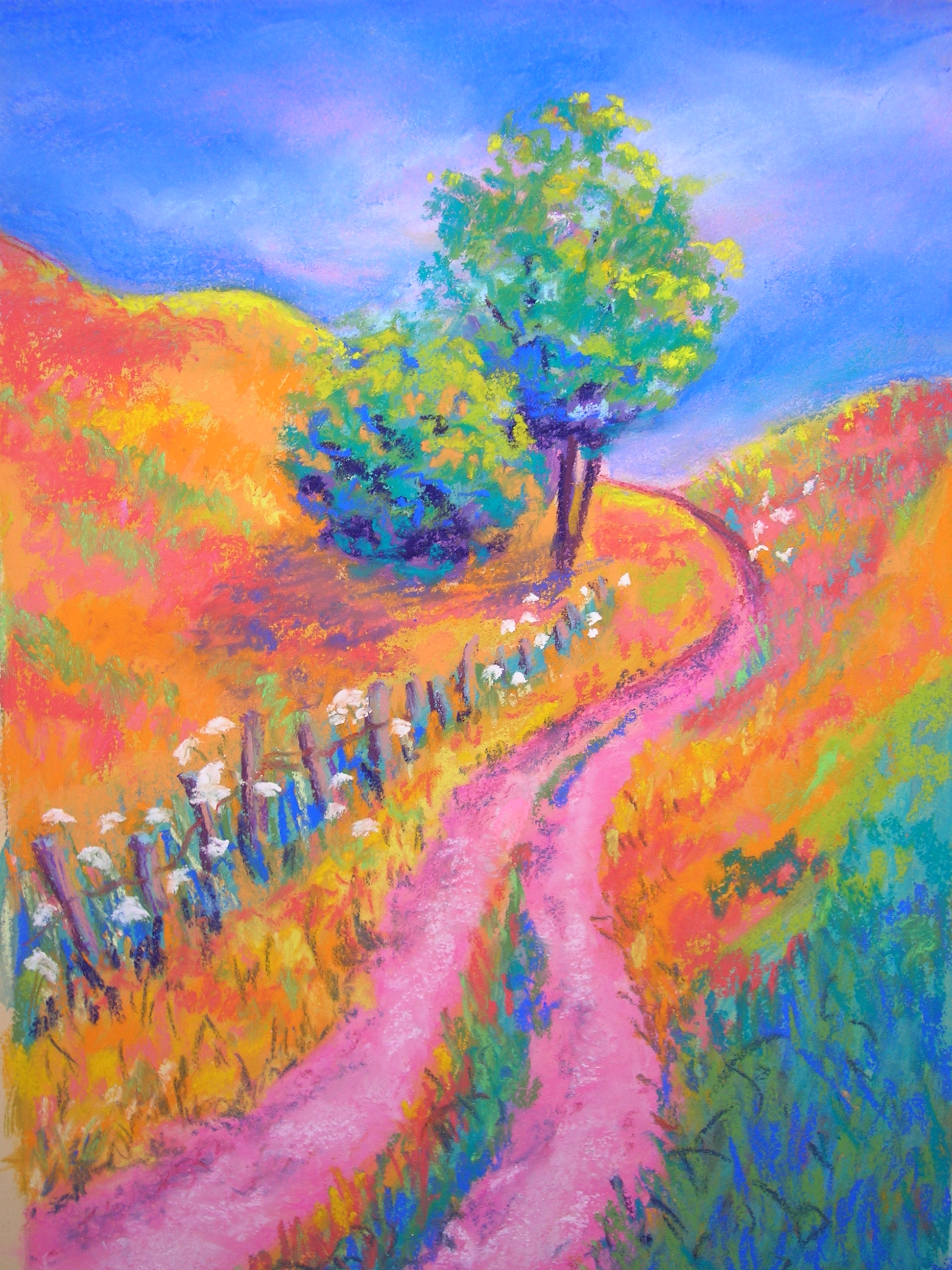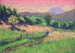 “Sherbet Road,” 7″ x 10″. This is another interpretation of  “Sky Road,” which you can see on the “sold” page. Since that one left, and I needed one of this scene for a special show (“In the Eye of the Beholder” – check out the description in “What’s New”), I figured that I would really go nuts with the color! Good enough to eat, isn’t it?