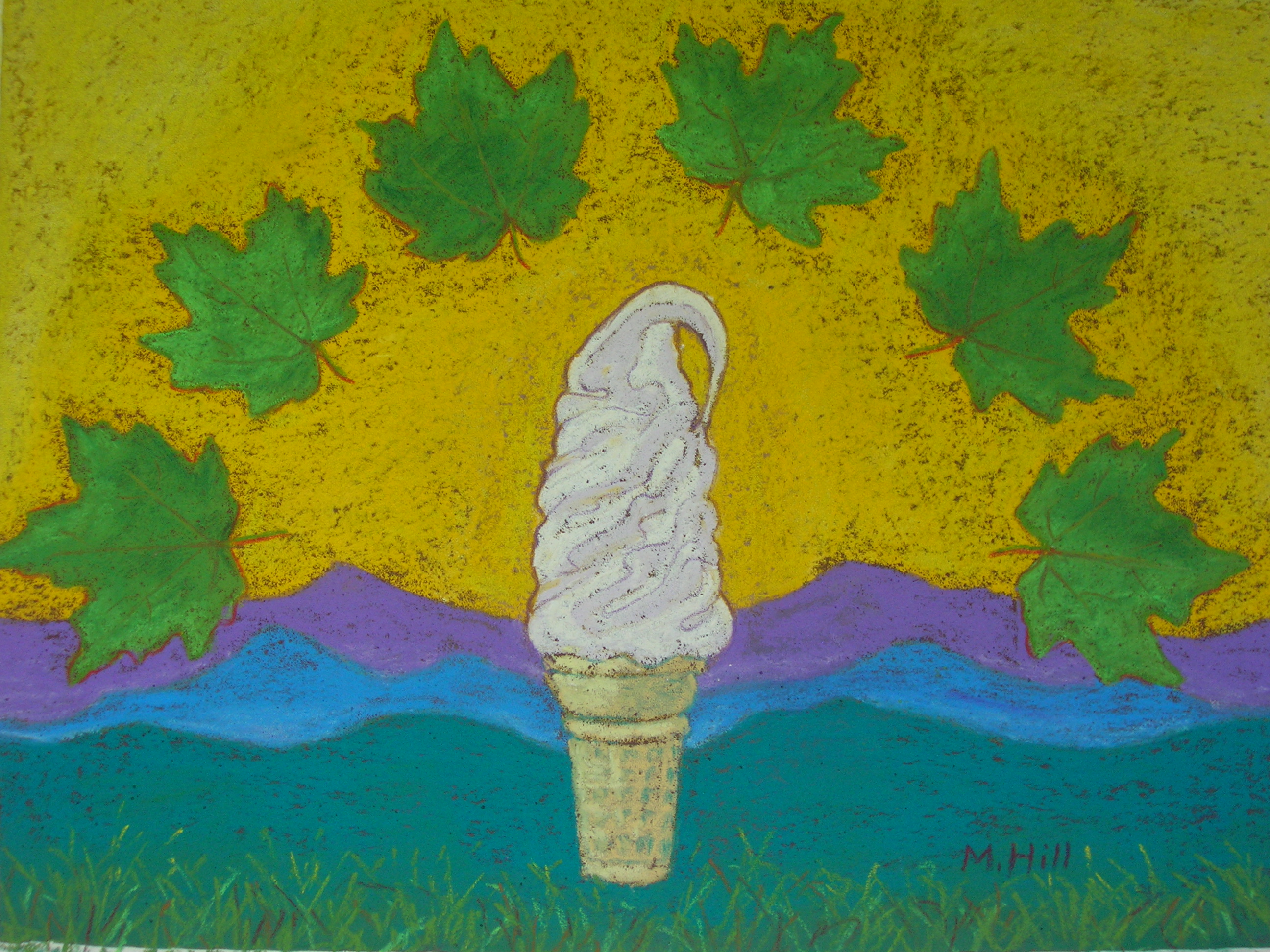 “Summer in Vermont 2,” 9″ x 12″. Here’s the second one. As you can see, I am naming the series “Summer in Vermont.” Nothing says summer like creemees! In this one, I decided to make a clear Vermont theme by adding an arc of maple leaves and a soft mountain background. To make the maple leaves, I went out and picked sugar maple leaves, laid them out on the floor, and took photos that I could then use as a guide. This, like the other creemee paintings, has a kind of stylized, graphic quality, which is a fun change for me.