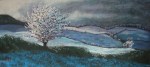 “In Winter’s Grip,” 9″ x 12″. This tree is right up the road from where I live; I go by it every time I walk in the morning. I love its shape. I don’t think you can tell with this wee photo, but I put subtle lines of bright color along some edges of the tree, suggesting the life force of the tree even in the grip of deep cold.