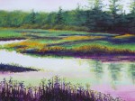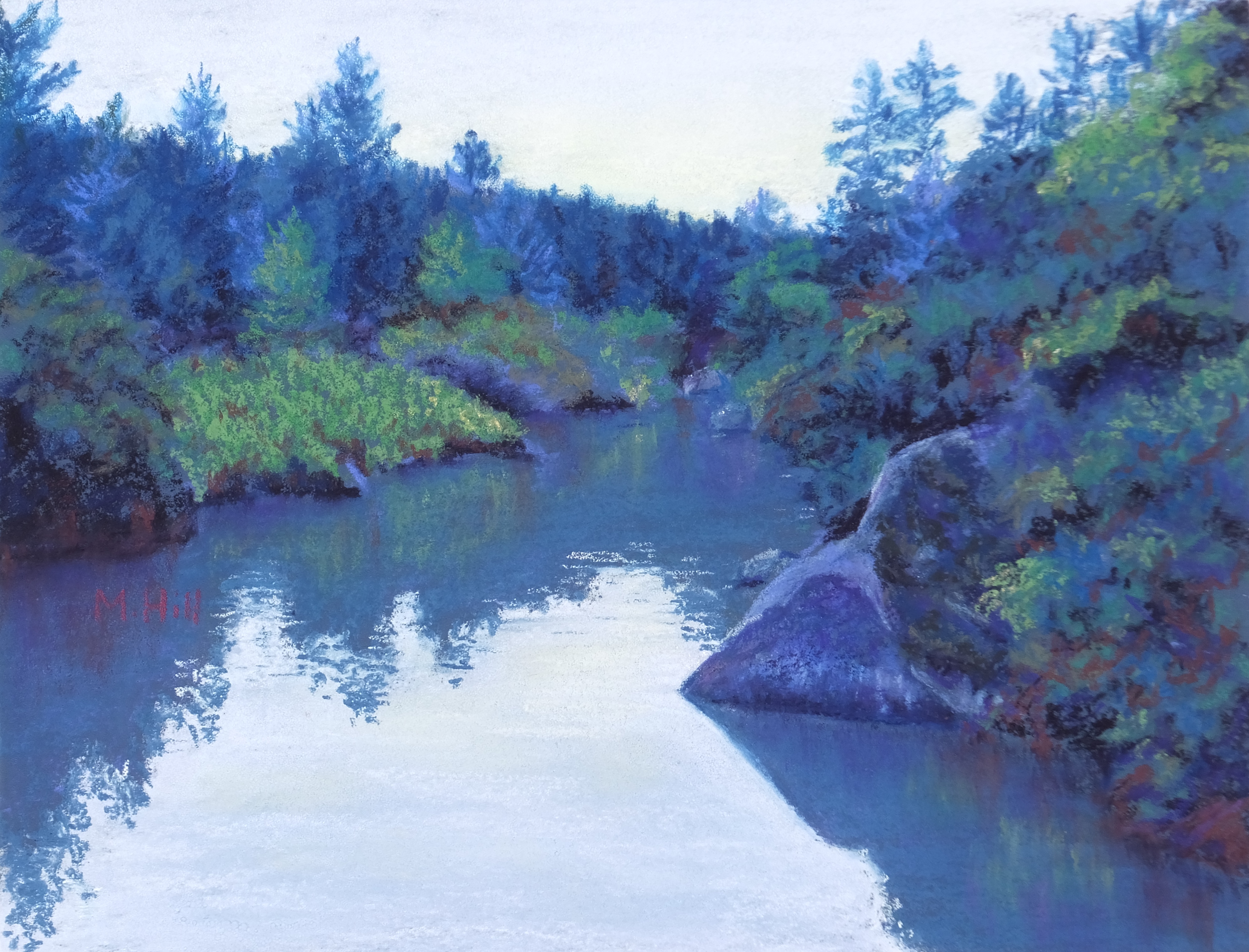 “River Light,” 9″ x 12″. Lovely quiet water. I enjoyed playing around with the color and adding the magentas to this scene.