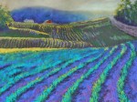 “June Rhythm,” 18″ x 24″. This scene is in Calais, a neighboring town. I was completely enamored of the patterns the rows of corn made. And it made me happy to translate that into  purple and teal stripes in the foreground.