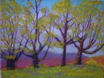 “Spring Sentinels,” 9″ x 12″. Another example of spring with really strong color. This view is also at the Sparrow Farm. How fortunate I am to live somewhere with subjects for art all around me! I like the rhythm of this row of trees, each with its own character.