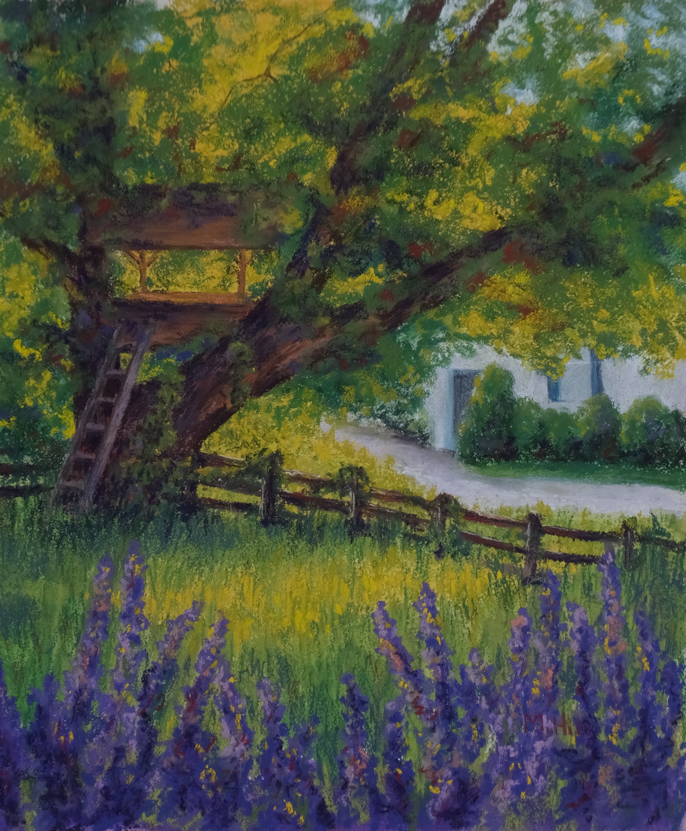 “Wanna Play?”, 14″ x 12″. Not sure whether you can see it in this little thumbnail, but the painting is of a treehouse, thus the title. I was so drawn to the way the late afternoon sun lit that gracious old tree from behind. It was the perfect place for a treehouse. Wanna play? I do!