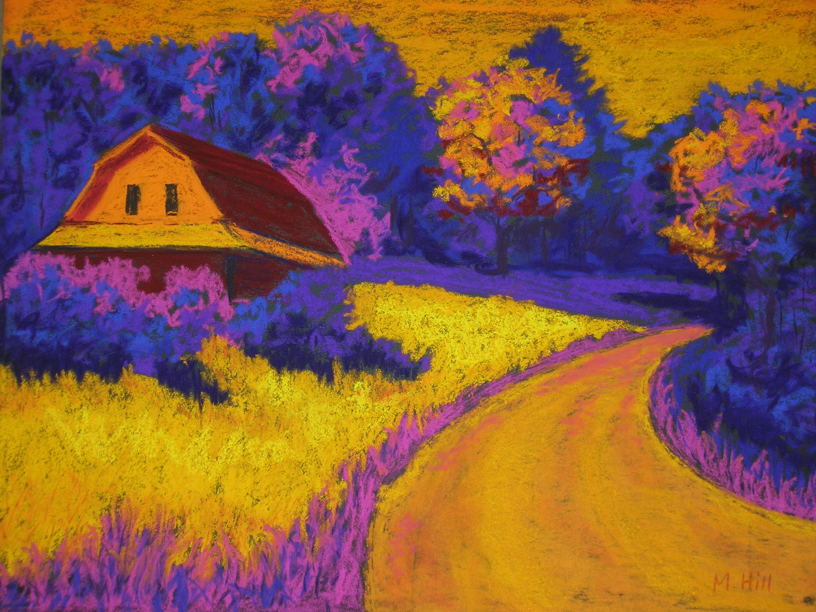 “Neon Barn,” 11″ x 14″. This was my initial experiment with color, what fun! I worked out the scene’s values (how light or dark each are was) and chose colors to reflect those values, but not necessarily reality. I like the result a lot. Check out the reference photo below.  You can see what happened!