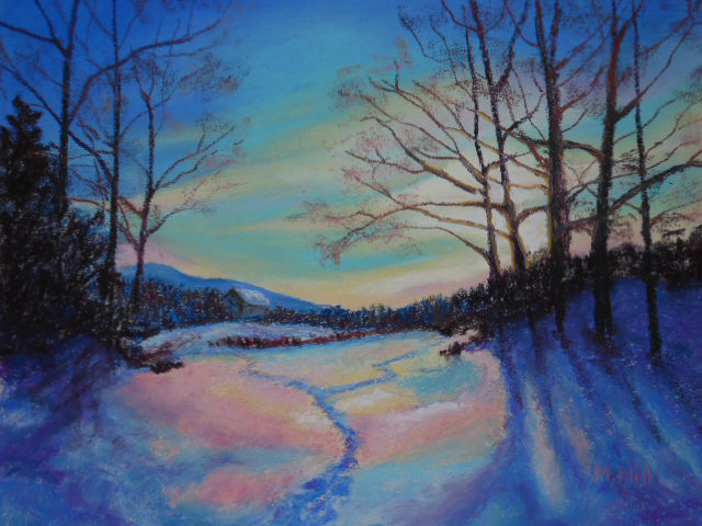 “Frosty Whitethorn, Tipperary,” 12″ x 26 5/8″. This was inspired by a photo taken by my cousin when she was visiting family in Ireland. They’d had a frost, which is very unusual there, and everything sparkled with it. I used iridescent pastels to capture that effect. I love this painting!