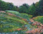 “Hidden Brook,” 14″ x 11″. Barely a brook, but the image of the water cutting through that intense spring green captured me. And I love the secret sunny area in the background.