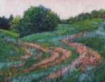 “Sky Road,” 12″ x 16″. This was a very blah scene, color-wise. The grasses were dry and pale gold, although green on the right: the road a nondescript tan: and the sky gray and white. But I liked the shapes and the lovely curve of the road. Look what a little inventive color can do! I made the cloud shapes echo the road subtly, which I think adds a nice movement to the scene, too.
