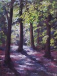 “Light Play,” 9″ x 12″. The name says it! Early morning light in the summer, washing the leaves and across the road with its brilliance. A very ordinary scene made memorable by that glow.