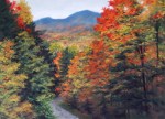 “Stowe Autumn,” 9″ x 12″. This is a view from behind the village, partway up the mountain road. I used black paper and a light touch to create a textured effect and to accentuate the powerful colors of fall. I like the results!